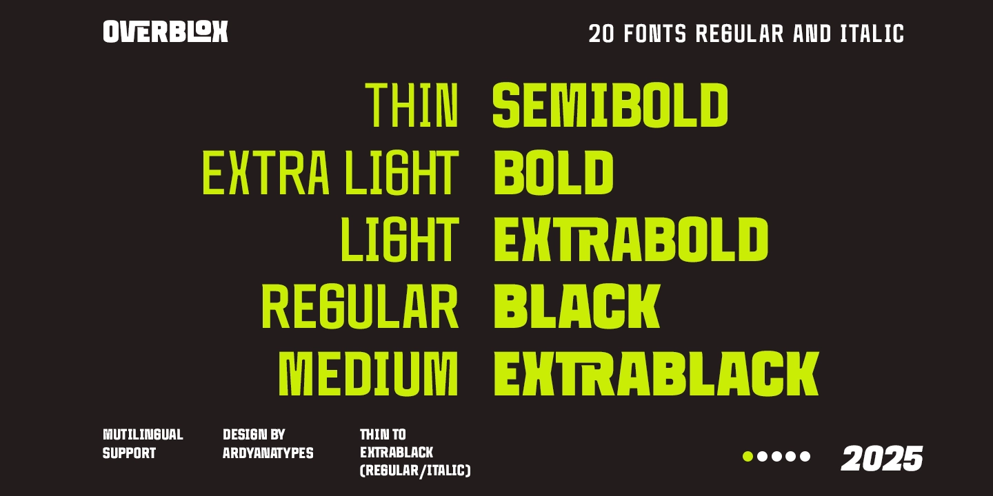 OVERBLOX is a bold display font built to hit hard and dominate every design. Featuring 20 styles from Thin to ExtraBlack, plus italic versions for Thin and ExtraBlack, OVERBLOX delivers ultimate versatility for all your creative needs. Its blocky, confident, and futuristic shapes make it perfect for streetwear branding, skateboard graphics, concert posters, game titles, and logos that demand attention.