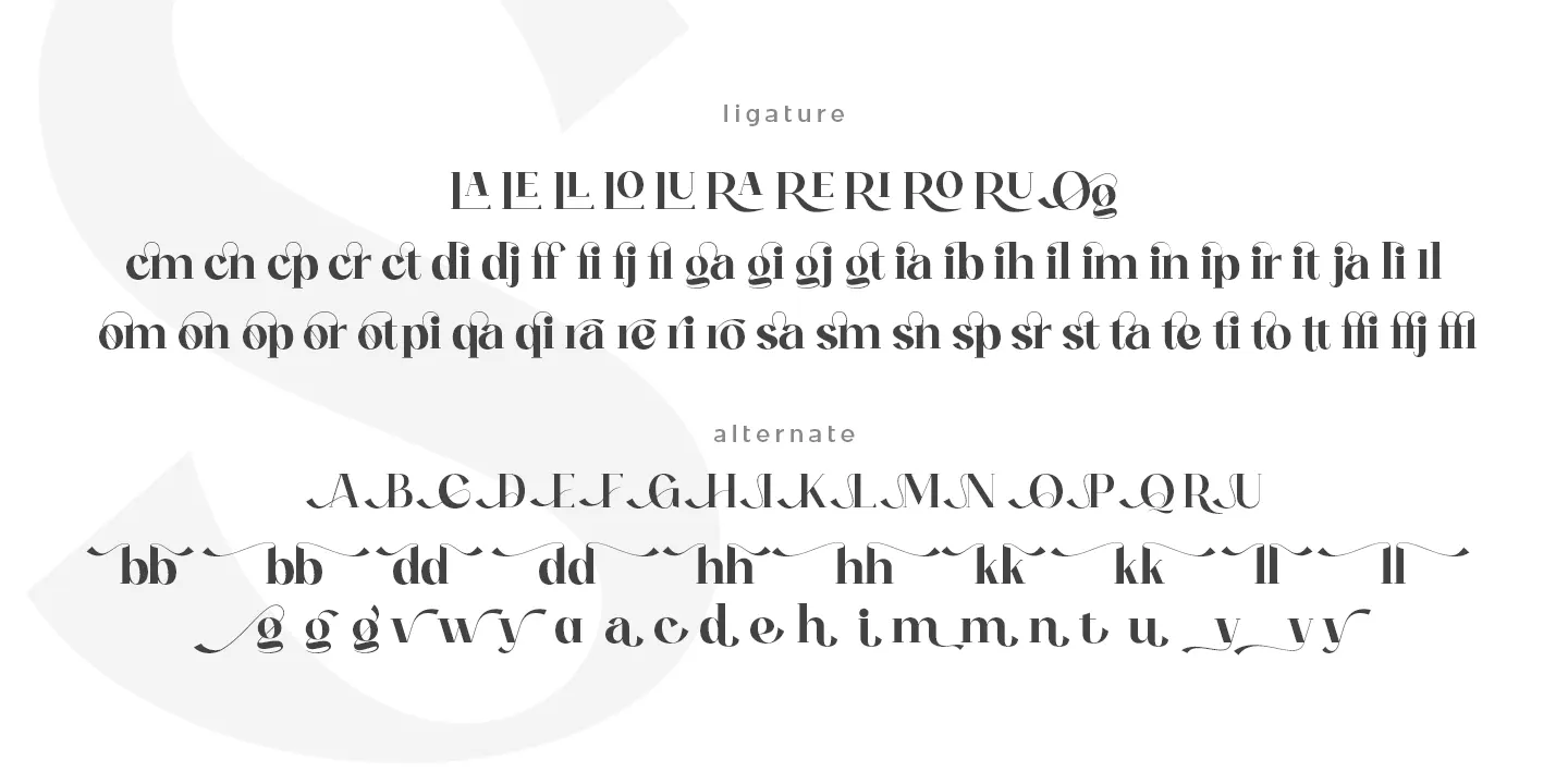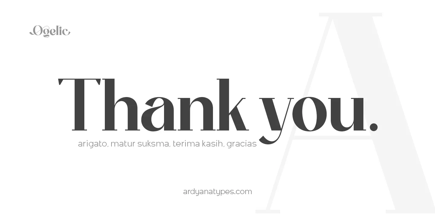 Ogelic Typeface Serif is modern and elegant. It pairs well with san serif as pictured or stands firm as a title and brand representative for an elegant look. This Ogelic Typeface is equipped with a modern professional character that can present an elegant and attractive identity for your company for business purposes such as business cards, name tags, and uniforms as a brand enhancement. This modern Ogelic typeface is suitable to be embossed as a letter nameplate or even pasted in your office with a cutting sticker that looks elegant. This elegant Ogelic-type shape is also stunning for book covers or magazine writing. You can see all the available characters in the screenshot above, and you can try the modern & elegant Ogelic now for any design issues. Ogelic also comes with multiple languages, making it easy for any country and language use. It also comes with alternative Ligatures and stylistics to make your designs more attractive.