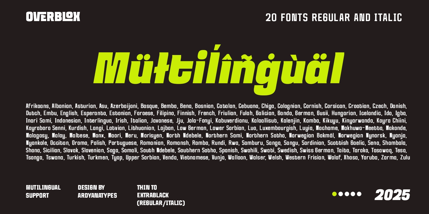OVERBLOX is a bold display font built to hit hard and dominate every design. Featuring 20 styles from Thin to ExtraBlack, plus italic versions for Thin and ExtraBlack, OVERBLOX delivers ultimate versatility for all your creative needs. Its blocky, confident, and futuristic shapes make it perfect for streetwear branding, skateboard graphics, concert posters, game titles, and logos that demand attention.